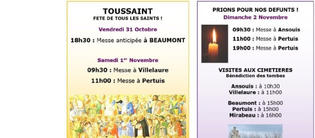 Les messes et propositions de la semaine Les messes et propositions de la semaine Dimanche 19 octobre : 29e dimanche du Temps Ordinaire « Cependant, le Fils de l’homme, quand il viendra, trouvera-t-il la foi sur la terre ? » suite…